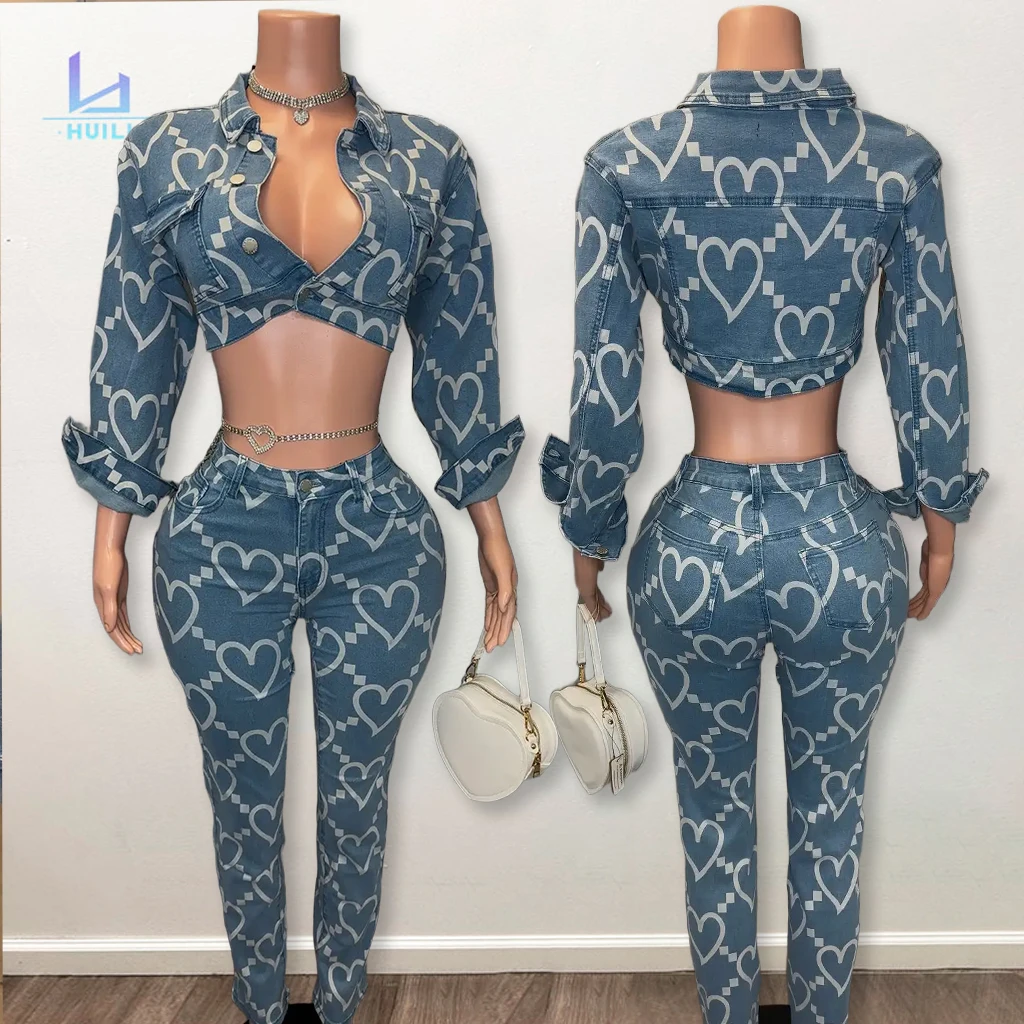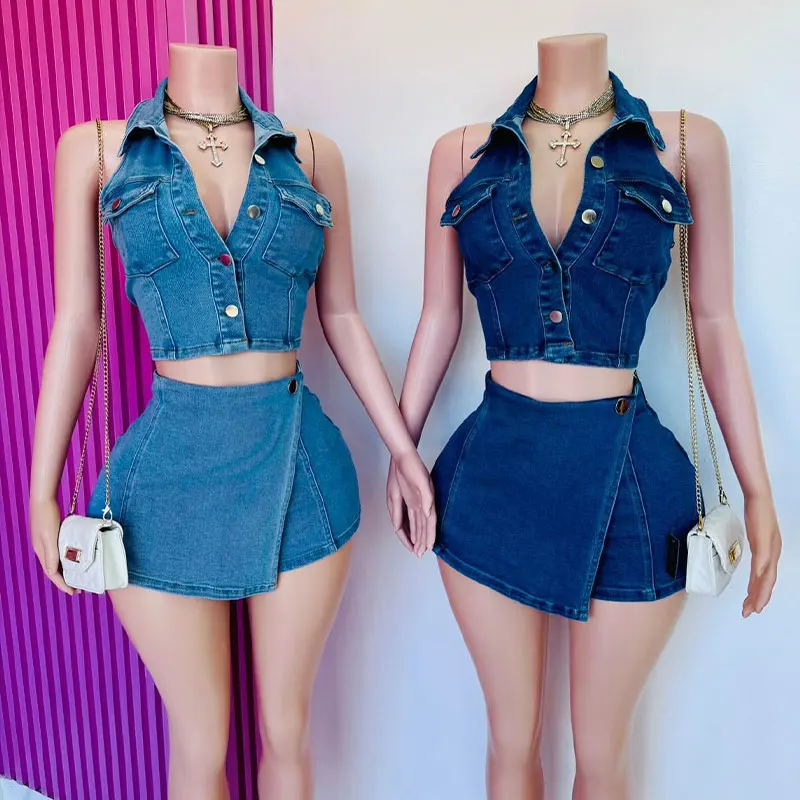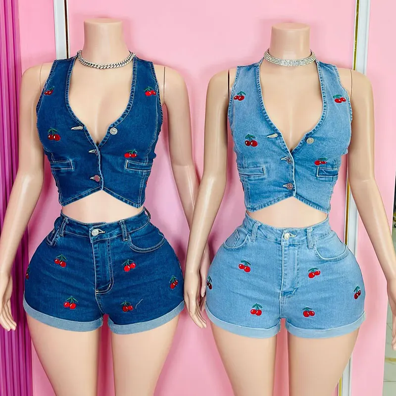 Huili Manufacturer Oem 2025 Sleeveless Button Down Top & Mini Shorts Denim Two Piece Custom Embroidery logo Women's Jeans Set